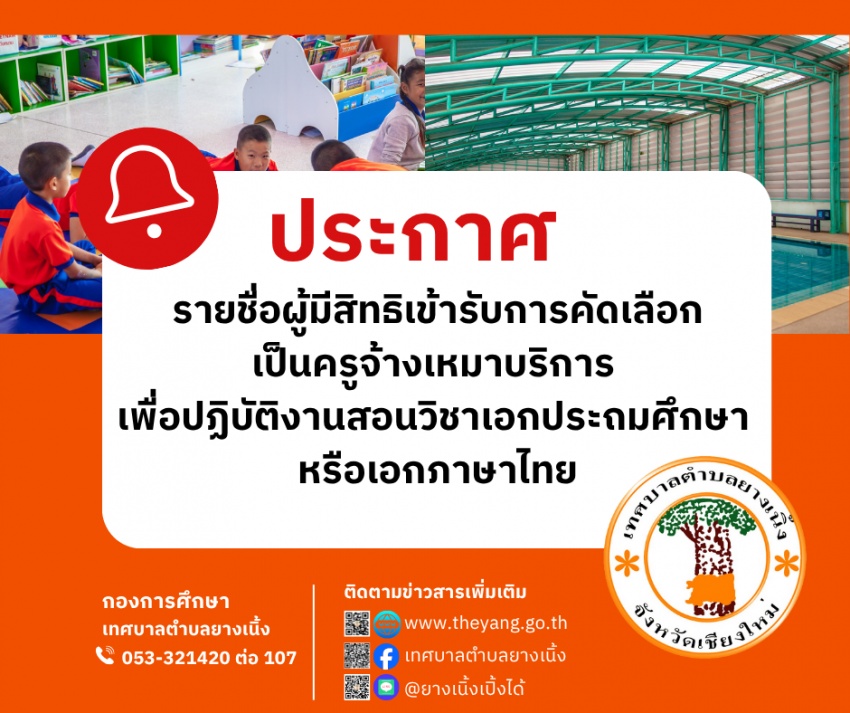 ประกาศ รายชื่อผู้มีสิทธิเข้ารับการคัดเลือกเป็นครูจ้างเหมาบริการ เพื่อปฏิบัติงานสอนวิชาเอกประถมศึกษา หรือเอกภาษาไทย