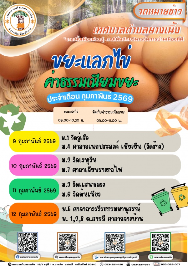 ตารางขยะแลกไข่และจัดเก็บค่าธรรมเนียมขยะประจำเดือนกุมภาพันธ์ 2569