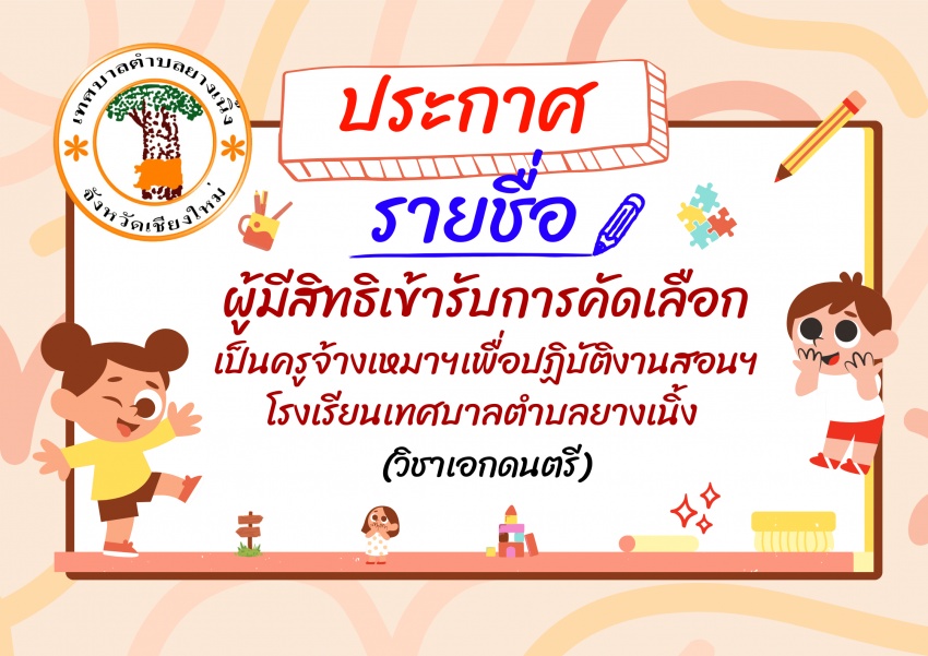 ประกาศรายชื่อผู้มีสิทธิเข้ารับการคัดเลือก เป็นครูจ้างเหมาฯเพื่อปฏิบัติงานสอนฯ โรงเรียนเทศบาลตำบลยางเนิ้ง