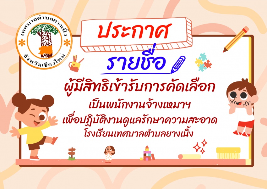 ประกาศรายชื่อผู้มีสิทธิเข้ารับการคัดเลือก เป็นพนักงานเหมาฯ เพื่อปฏิบัติงานดูแลรักษาความสะอาด โรงเรียนเทศบาลตำบลยางเนิ้ง