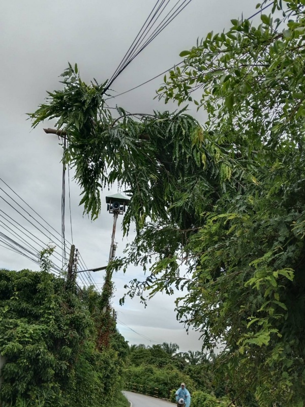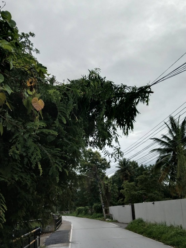 พอดีมีต้นไม้หักหน้าหน้าล้ำไปทางถนนและพาดสายสื่อสารเมื่อวาน ได้ทำการแก้ปัญหาเบื้องต้นโดยการตัดส่วนส่วนที่จะเป็นอันตรายต่อผู้สัญจรไปมาแล้ว แต่มีส่วนที่อยู่สูงและพาดกับสายสื่อสารไม่สามารถเอาลงได้ จะรบกวนขอทางเทศบาลมาตัดให้ค่ะ สถานที่หน้าหมู่บ้านแปดหลัง ม.1 ค่ะ