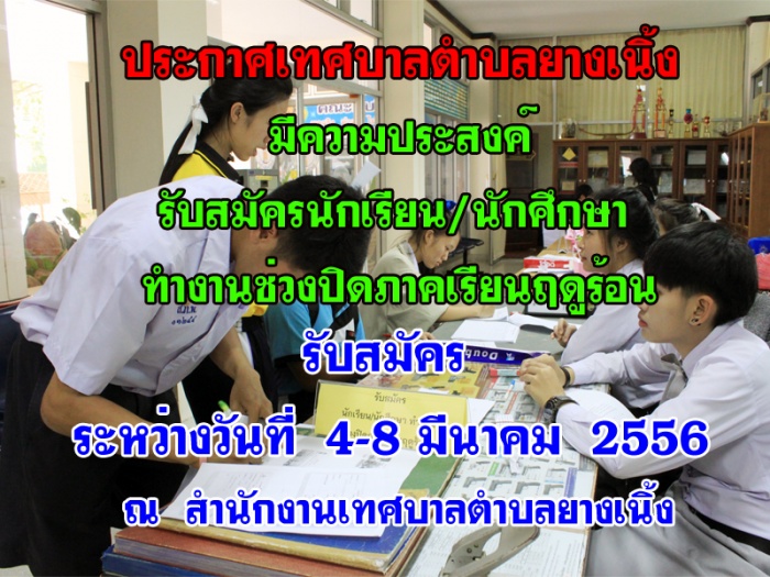 เทศบาลตำบลยางเนิ้ง มีความประสงค์ รับสมัครนักเรียน/นักศึกษา ปฏิบัติงานช่วงปิดภาคเรียนฤดูร้อน เปิดรับสมัครตั้งแต่วันที่ 4-8 มีนาคม 2556