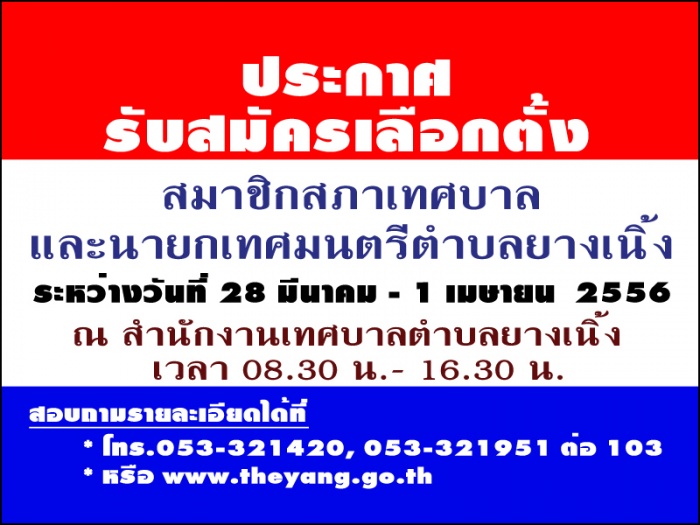 ประกาศรับสมัครเลือกตั้งสมาชิกสภาเทศบาลและนายกเทศมนตรีตำบลยางเนิ้ง