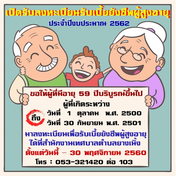 เทศบาลตำบลยางเนิ้ง เปิดรับลงทะเบียนเพื่อขอรับเบี้ยยังชีพผู้สูงอายุ ประจำปีงบประมาณ 2562