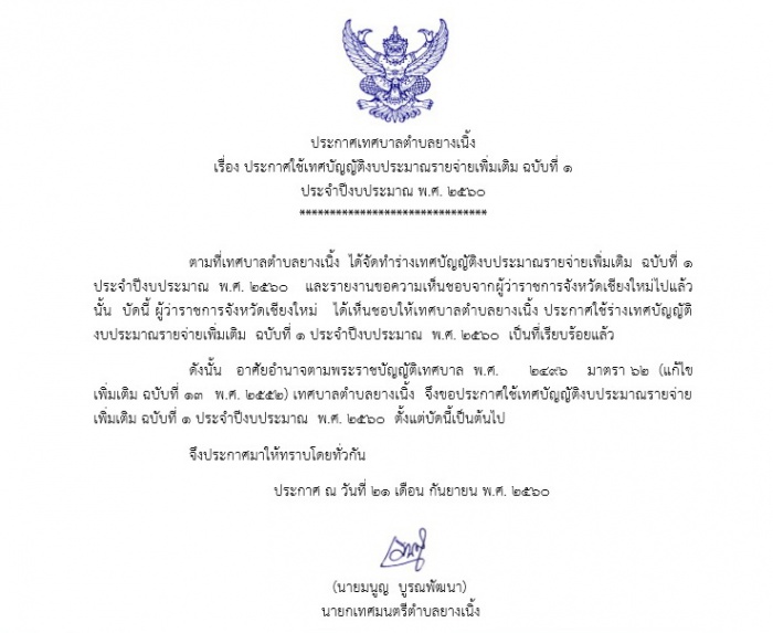 ประกาศใช้เทศบัญญัติงบประมาณรายจ่าย เพิ่มเติม ฉบับที่ 1 ประจำปีงบประมาณ พ.ศ. 2560