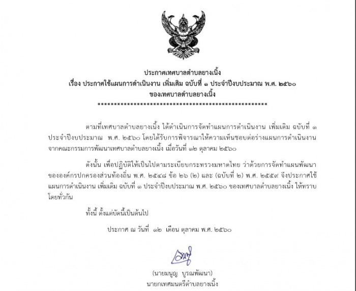 ประกาศใช้เเผนการดำเนินงาน เพิ่มเติม ฉบับที่ 1 ประจำปีงบประมาณ พ.ศ. 2560