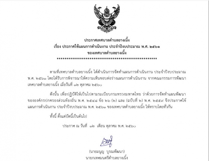 ประกาศใช้เเผนการดำเนินงาน ประจำปีงบประมาณ พ.ศ. 2561