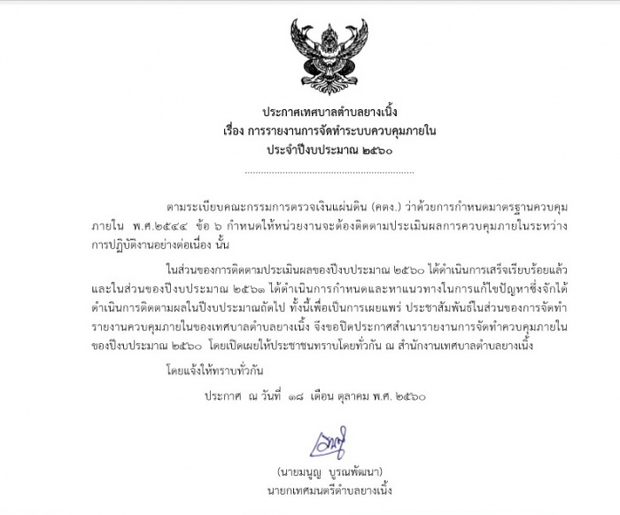 ประกาศการรายงานการจัดทำระบบควบคุมภายใน ประจำปีงบประมาณ 2560
