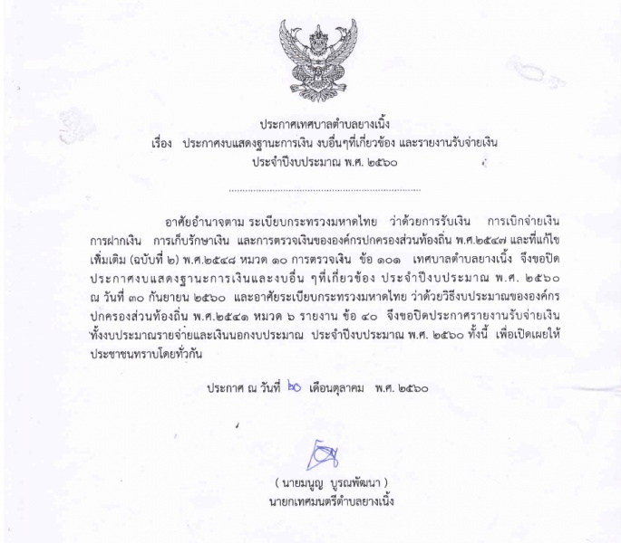 เทศบาลตำบลยางเนิ้ง ขอแสดงงบแสดงฐานะการเงินและงบอื่นๆ และรายงานรับ-จ่ายเงิน ประจำปีงบประมาณ 2560 ณ วันที่ 30 กันยายน 2560 เพื่อเผยเเพร่ให้ประชาชนทราบโดยทั่วกัน