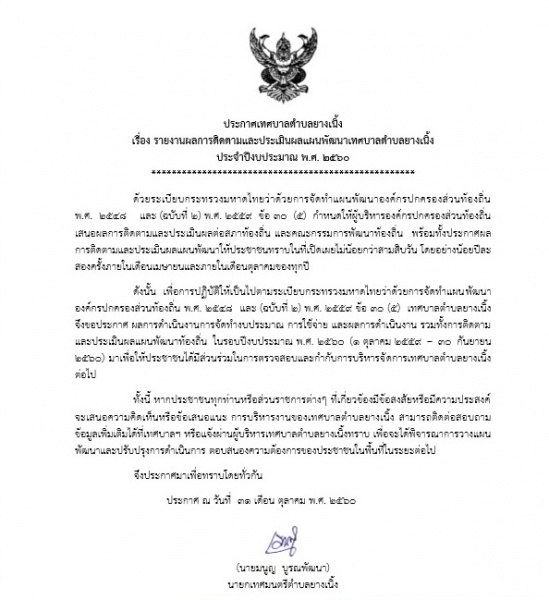 ประกาศรายงานติดตามและประเมินผลเเผนพัฒนาเทศบาลตำบลยางเนิ้ง ฉบับที่ 2 ประจำปีงบประมาณ พ.ศ. 2560