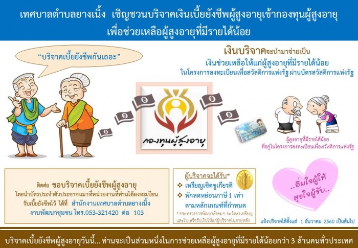 เทศบาลตำบลยางเนิ้ง เชิญชวนบริจาคเงินเบี้ยยังชีพผู้สูงอายุเข้ากองทุนผู้สูงอายุ เพื่อช่วยเหลือผู้สูงอายุที่มีรายได้น้อย