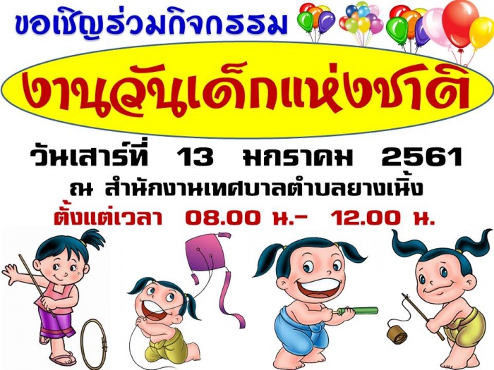 ขอเชิญร่วมกิจกรรมงานวันเด็กแห่งชาติ ประจำปี 2561 วันเสาร์ที่ 13 มกราคม 2561 ตั้งแต่เวลา 08.00 น.- 12.00 น. ณ บริเวณสำนักงานเทศบาลเทศบาลตำบลยางเนิ้ง