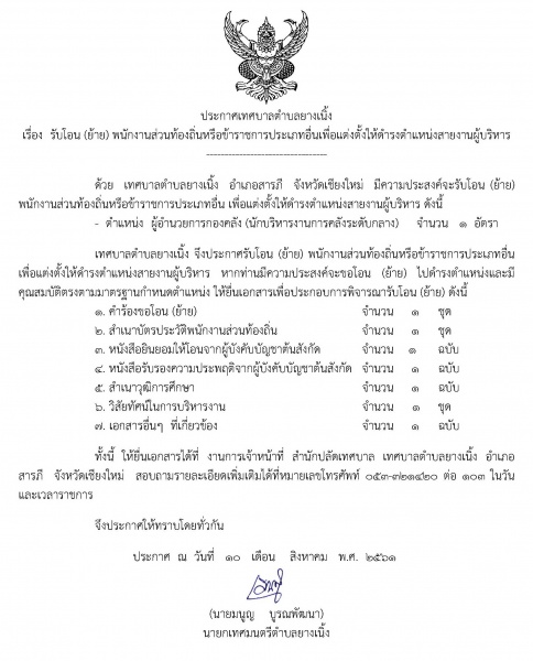 ประกาศฯ รับโอน (ย้าย) พนักงานส่วนท้องถิ่นหรือข้าราชการประเภทอื่นเพื่อแต่งตั้งให้ดำรงตำแหน่งสายงานผู้บริหาร