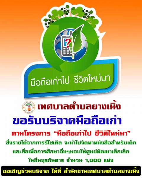 กรมส่งเสริมการปกครองท้องถิ่นร่วมกับมูลนิธิสมเด็จพระเทพรัตนราชสุดา และอีกหลายภาคีเครือข่าย ขอรับบริจาคมือถือเก่าตามโครงการ “มือถือเก่าไป ชีวิตใหม่มา" เพื่อมอบหนังสือ ให้ศูนย์พัฒนาเด็กเล็ก” ซึ่งรายได้จากการรีไซเคิล จะนำไปจัดหาหนังสือสำหรับเด็กและสื่อเพื่อการศึกษาอื่นๆ มอบให้ศูนย์พัฒนาเด็กเล็กขององค์กรปกครองส่วนท้องถิ่นในถิ่นทุรกันดาร จำนวน 1,000 แห่ง เทศบาลตำบลยางเนิ้ง ขอเชิญชวนประชาชนทีมีมือถือเก่าไม่ได้ใช้แล้ว ร่วมบริจาคได้ที่ สำนักงานเทศบาลตำบลยางเนิ้ง ติดต่อสอบถาม โทร.053-321420 ต่อ 107 กองการศึกษา