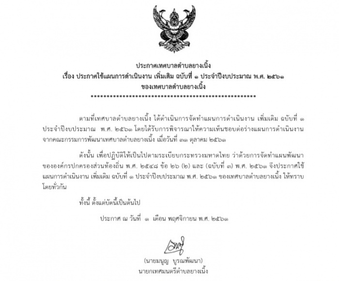 ประกาศ เรื่อง เเผนการดำเนินงาน เพิ่มเติม ฉบับที่ 1 ประจำปีงบประมาณ พ.ศ. 2561