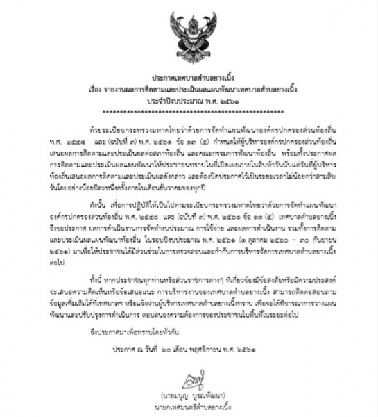 ประกาศใช้ รายงานผลการติดตามและประเมินผลเเผนพัฒนาเทศบาลตำบลยางเนิ้ง ประจำปีงบประมาณ พ.ศ. 2561 ฉบับที่ 2
