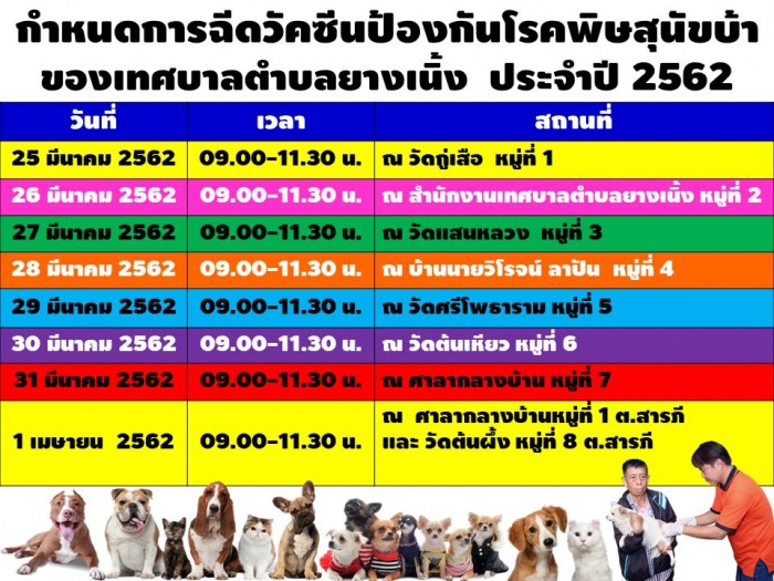 กำหนดการฉีดวัคซีนป้องกันโรคพิษสุนัขบ้า ของเทศบาลตำบลยางเนิ้ง ประจำปี ๒๕๖๒