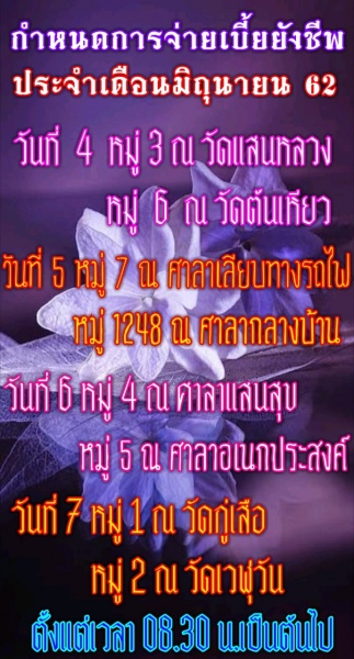 กำหนดการจ่ายเบี้ยยังชีพ ประจำเดือนมิถุนายน ๒๕๖๒