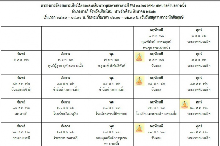 ตารางเสียงไร้สายของเทศบาลตำบลยางเนิ้ง ประจำเดือน สิงหาคม