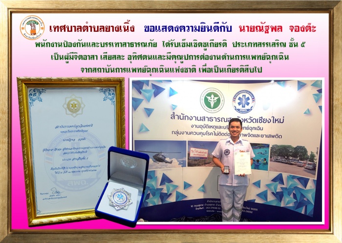 เทศบาลตำบลยางเนิ้ง ขอแสดงความยินดีกับ นายณัฐพล จองต๊ะ พนักงานป้องกันและบรรเทาสาธารณภัย ได้รับเข็มเชิดชูเกียรติ