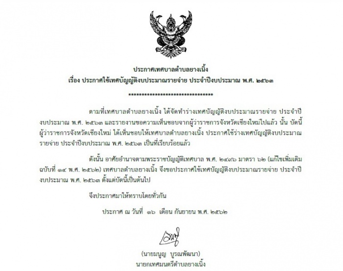 ประกาศใช้เทศบัญญัติงบประมาณรายจ่าย ประจำปีงบประมาณ พ.ศ. 2563