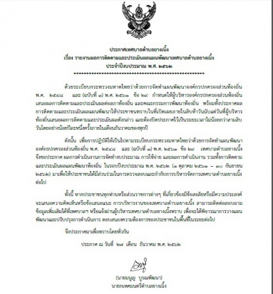 รายงานผลการติดตามและประเมินผลแผนพัฒนาเทศบาลตาบลยางเนิ้ง ประจาปีงบประมาณ พ.ศ. 2562