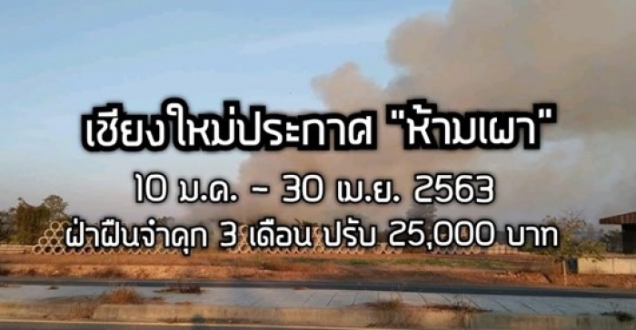 เชียงใหม่ประกาศห้ามเผาในที่โล่งทุกชนิด ตั้งแต่วันที่ 10 ม.ค. - 30 เม.ย. 2563 ฝ่าฝืนจำคุก 3 เดือน ปรับ 25,000 บาท