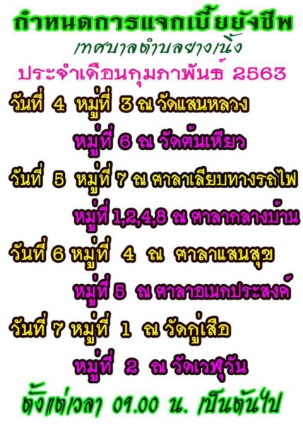 กำหนดการจ่ายเบี้ยยังชีพฯ ประจำเดือน กุมภาพันธ์ 2563