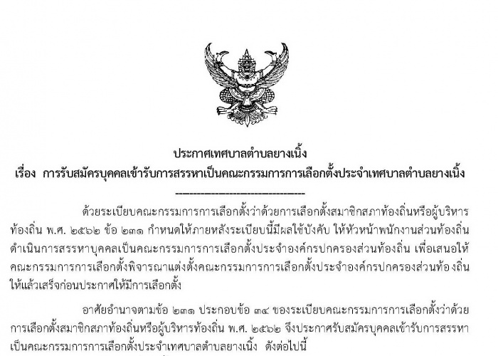 ประกาศเทศบาลตำบลยางเนิ้ง เรื่อง การรับสมัครบุคคลเข้ารับการสรรหาเป็นคณะกรรมการการเลือกตั้งประจำเทศบาลตำบลยางเนิ้ง