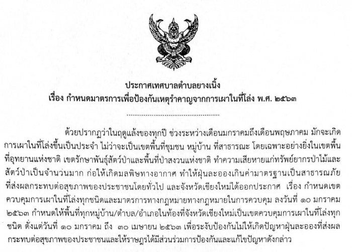 ประกาศ เรื่อง กำหนดมาตรการเพื่อป้องกันเหตุรำคาญจากการเผาในที่โล่ง