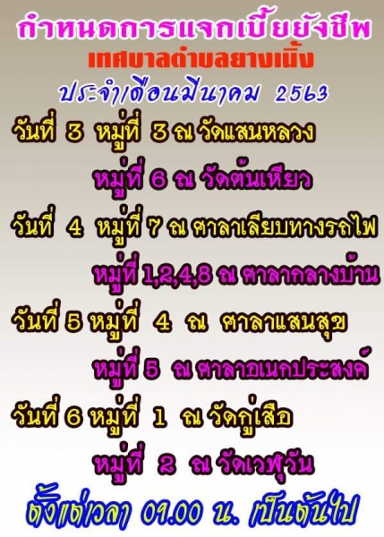 กำหนดการจ่ายเบี้ยยังชีพฯ ประจำเดือน มีนาคม 2563