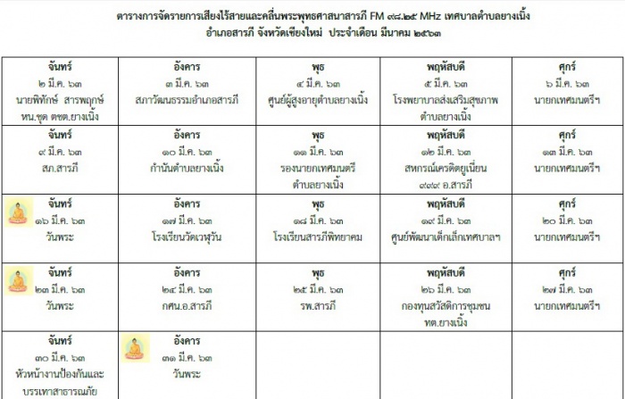 ตารางเสียงไร้สายของเทศบาลตำบลยางเนิ้ง ประจำเดือนมีนาคม