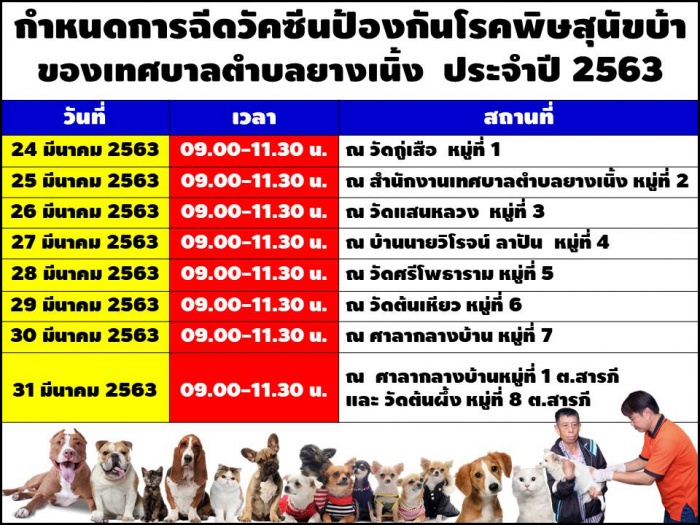 กำหนดการฉีดวัคซีนป้องกันโรคพิษสุนัขบ้าเทศบาลตำบลยางเนิ้ง ประจำปี ๒๕๖๓