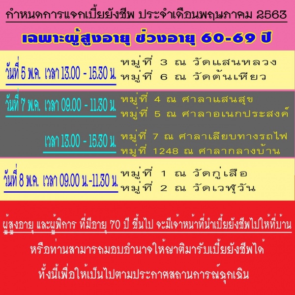 กำหนดการจ่ายเบี้ยยังชีพฯ ประจำเดือน พฤษภาคม 2563