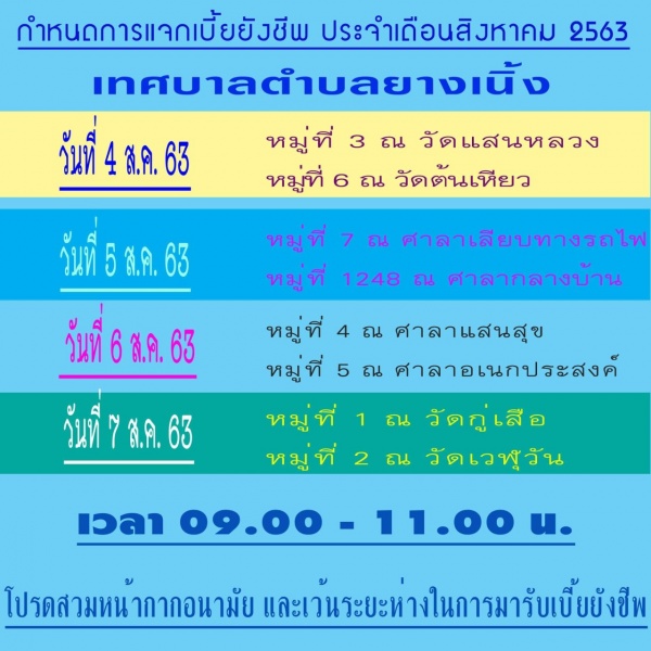 กำหนดการแจกเบี้ยยังชีพประจำเดือนสิงหาคม ๒๕๖๓