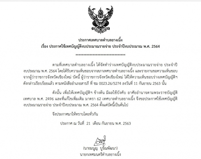 ประกาศ เรื่อง ประกาศใช้เทศบัญญัติงบประมาณรายจ่าย ประจำปีงบประมาณ พ.ศ. 2564