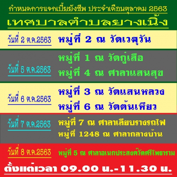 ประชาสัมพันธ์ กำหนดการแจกเบี้ยยังชีพ ประจำเดือนตุลาคม พ.ศ.2563