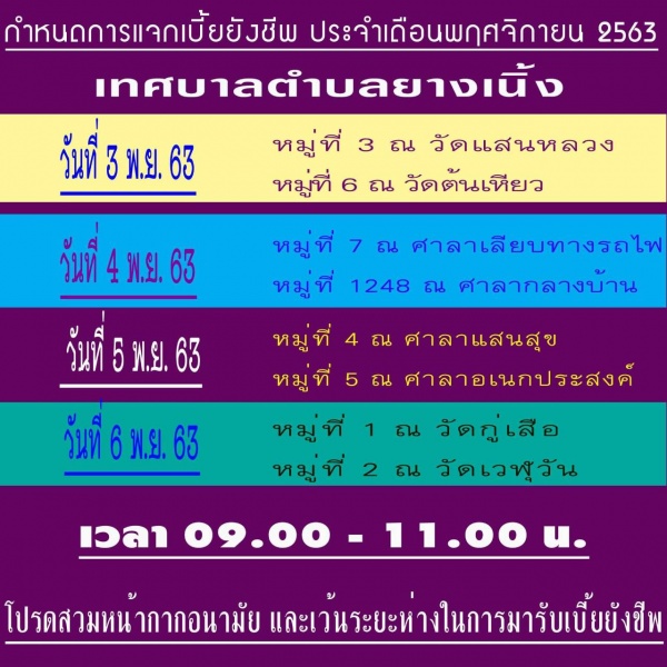 กำหนดการจ่ายเบี้ยยังชีพฯ ประจำเดือน พฤศจิกายน พ.ศ.2563