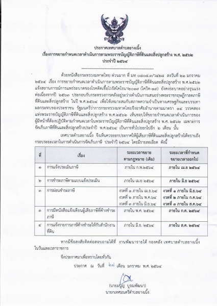 ประกาศ เรื่อง การขยายกำหนดเวลาดำเนินการตาม พรบ.ภาษีที่ดินและสิ่งปลูกสร้าง พ.ศ.2562 ประจำปี 2564