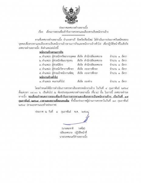 ประกาศเทศบาลตำบลยางเนิ้ง เรื่อง เลื่อนการสอบเพื่อเข้ารับการสรรหาและเลือกสรรเป็นพนักงานจ้าง