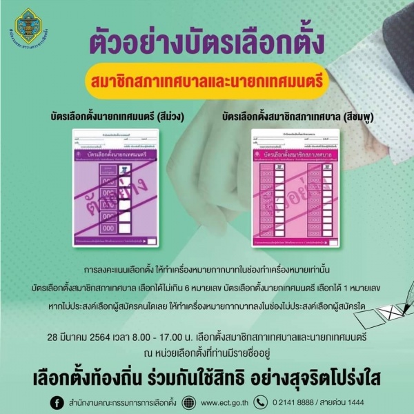 สำนักงานคณะกรรมการการเลือกตั้ง เปิดเผยภาพตัวอย่างบัตรเลือกตั้งสมาชิกสภาเทศบาลและนายกเทศมนตรี ก่อนจะถึงวันเลือกตั้งในวันอาทิตย์ที่ 28 มีนาคมนี้ พร้อมระบุว่า ผู้มีสิทธิเลือกตั้งจะได้รับบัตรเลือกตั้ง จำนวน 2 ใบ ในการออกเสียงลงคะแนน คือ