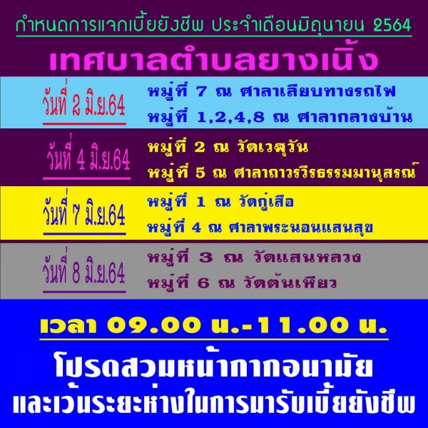กำหนดการจ่ายเบี้ยยังชีพฯ ประจำเดือน มิถุนายน 2564