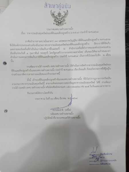 ประกาศเทศบาลตำบลยางเนิ้ง เรื่อง ราคาประเมินทุนทรัพย์ของที่ดินและสิ่งปลูกสร้าง (ภ.ด.ส.1) ประจำปี 2564