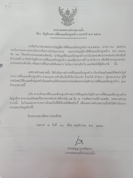 ประกาศเทศบาลตำบลยางเนิ้ง เรื่อง บัญชีรายการที่ดินและสิ่งปลูกสร้าง ประจำปี พ.ศ. 2564 (ภดส.3)