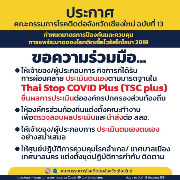 ประกาศคณะกรรมการโรคติดต่อจังหวัดเชียงใหม่ ฉบับที่ 13 เรื่อง กำหนดมาตรการป้องกันและควบคุมการแพร่ระบาดของโรคติดเชื้อไวรัสโคโรน่า 2012 ให้เจ้าของ ผู้ประกอบการ ประเมินตนเองตามมาตรฐานควบคุมโควิด-19 อย่างสม่ำเสมอ