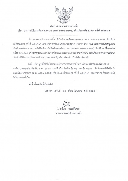 ประกาศใช้เเผนพัฒนาท้องถิ่น (พ.ศ. 2561-2565) เพิ่มเติม/เปลี่ยนเเปลง ครั้งที่ 2/2564