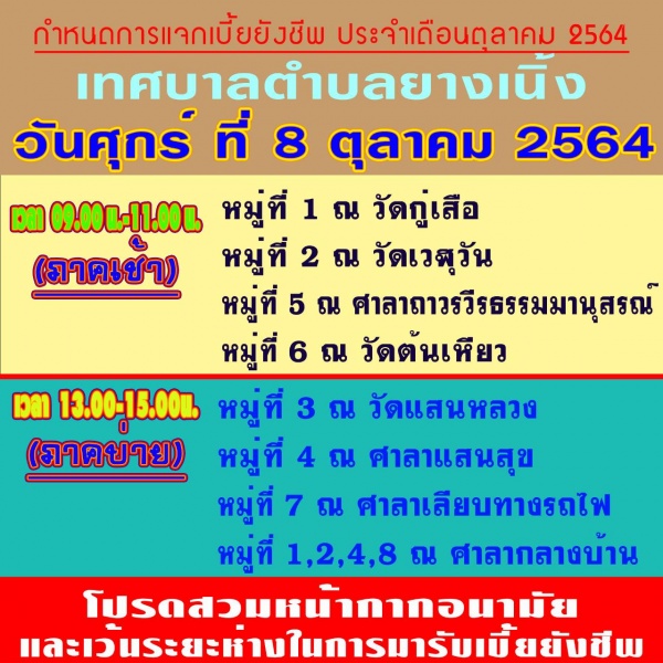 กำหนดการจ่ายเบี้ยยังชีพฯ ประจำเดือน ตุลาคม 2564