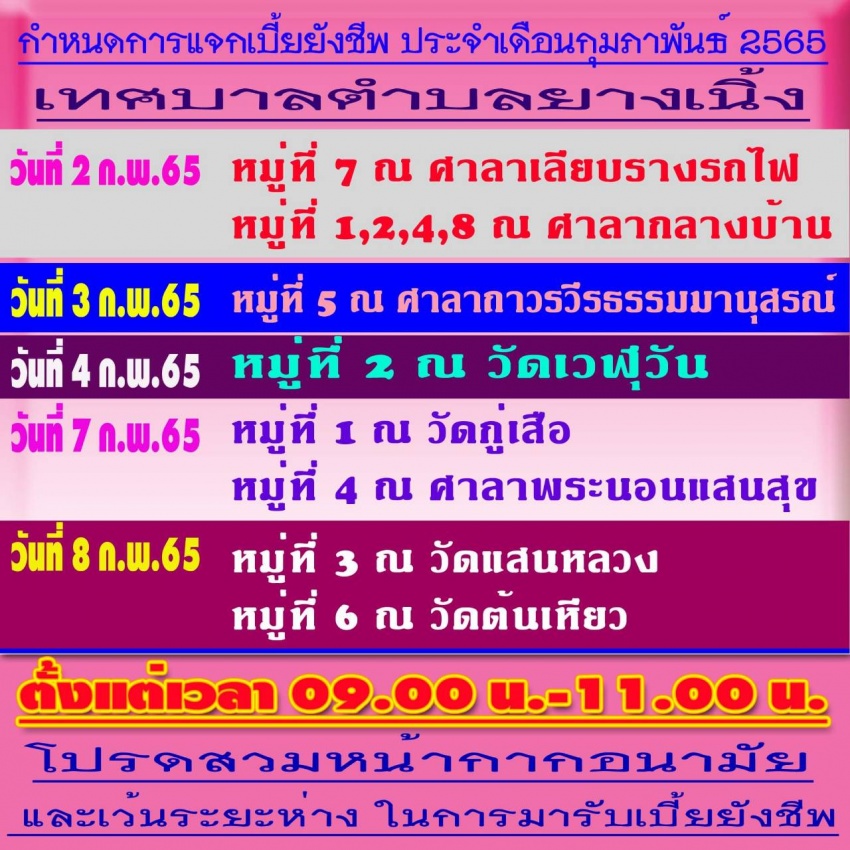 กำหนดการแจกเบี้ยยังชีพประจำเดือนกุมภาพันธ์ 2565