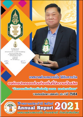 เทศบาลตำบลยางเนิ้ง ได้ดำเนินการจัดทำวารสารรายงานผลการปฏิบัติงานประจำปี 2564 เพื่อประชาสัมพันธ์เผยแพร่ผลงาน โครงการ และกิจกรรมต่างๆ ที่เทศบาลตำบลยางเนิ้งได้ดำเนินการในรอบปี ให้กับประชาชนทั่วไป หน่วยงานต่างๆ และ ผู้ที่สนใจ ได้รับทราบ และเพื่อให้การบริหารจัดการในเรื่องดังกล่าวเกิดประสิทธิภาพสูงสุด และสอดคล้องกับความต้องการของ พี่น้องประชาชนในเขตเทศบาลตำบลยางเนิ้ง (คลิกที่รูปเพื่ออ่านรายงานประจำปี 2564)