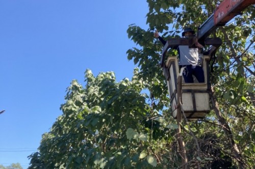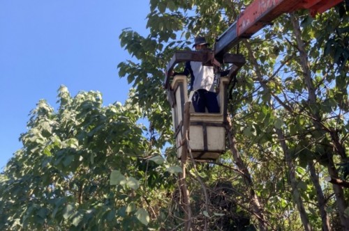 งานป้องกันและบรรเทาสาธารณภัย เทศบาลตำบลยางเนิ้ง ออกให้บริการตัดแต่งกิ่งไม้ ที่แผ่กิ่งก้านล้ำมาบนถนน ซึ่งอาจเป็นอันตรายแก่ผู้ที่สัญจรไปมา บริเวณถนนหมู่ 1 ตำบลยางเนิ้ง ตามคำบอกของพ่อหลวงในที่ประชุมวาระยามเช้า